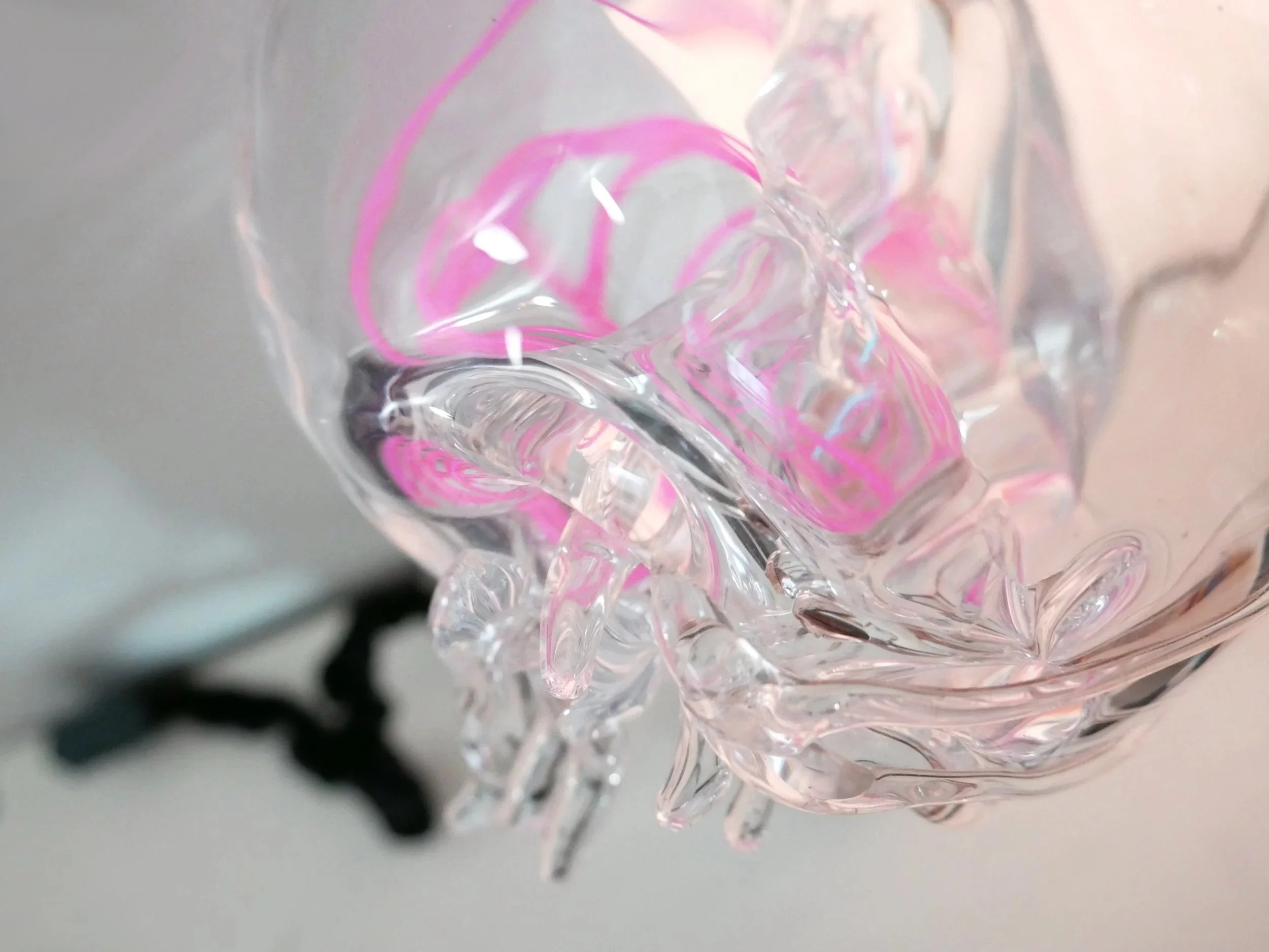 Deep water bug inspired glass sculpture mounted on a chrome base with EL light wire interior glow effect.