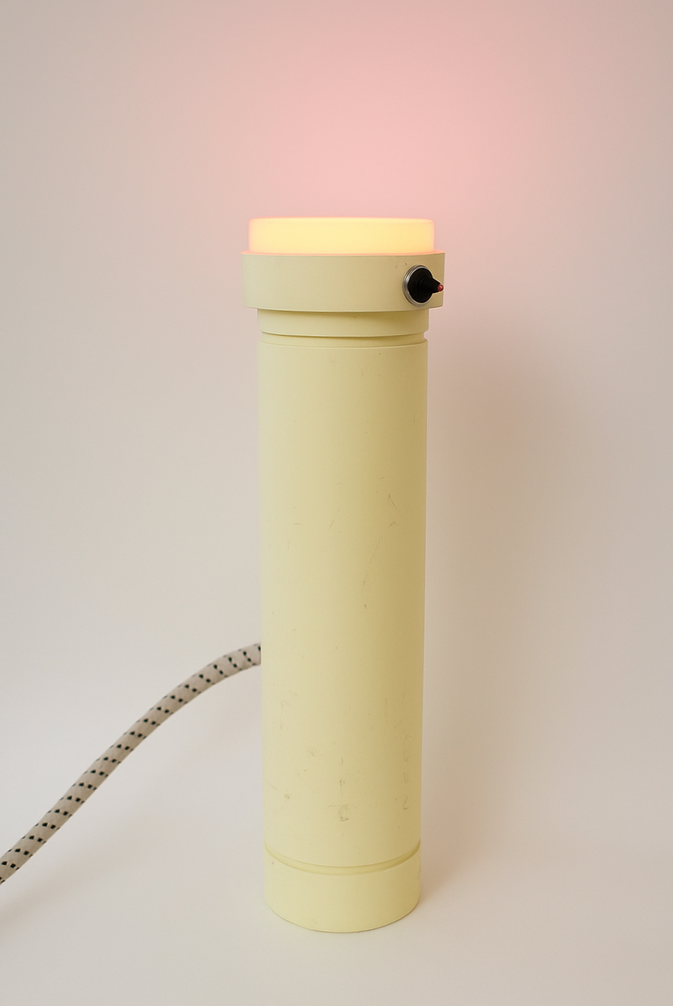 Table lamp made from a construction water pipe, retro radio nob and a vintage vacuum cleaner pipe